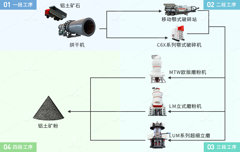 鋁土礦石加工生產(chǎn)工藝主要包括:煅燒、破碎、粉磨、成品包裝四個階段。