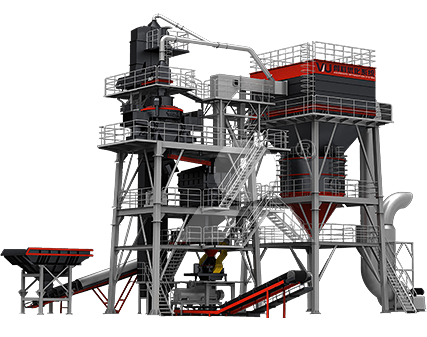 整形制砂系統(tǒng)選用3臺VUS450骨料優(yōu)化系統(tǒng),原料通過斗提機(jī)被送入頂樓,由原料輸送皮帶將0—40mm的碎石送入VUS沖擊破,經(jīng)過高頻石打石研磨后進(jìn)入石粉分離室,通過調(diào)整控粉箱進(jìn)風(fēng)口大小和系統(tǒng)風(fēng)量來調(diào)節(jié)制砂含粉量;處理后的物料進(jìn)入分選篩內(nèi)分選出精品碎石、石粉及準(zhǔn)成品砂。其中石粉通過除塵及粉塵收集系統(tǒng)處理后收集為精品石粉,準(zhǔn)成品砂通過加濕攪拌機(jī)均勻拌合后即為精品機(jī)制砂。